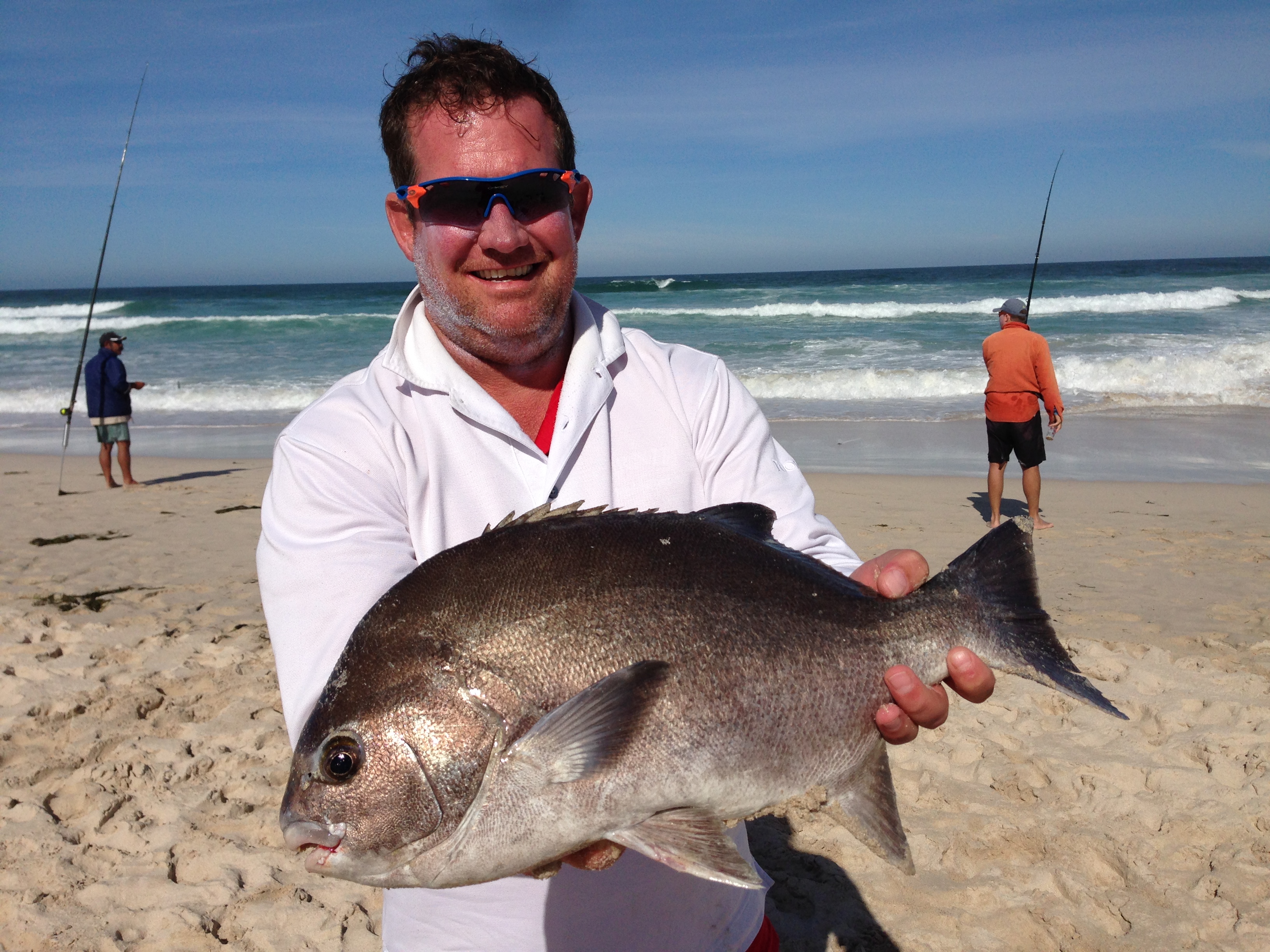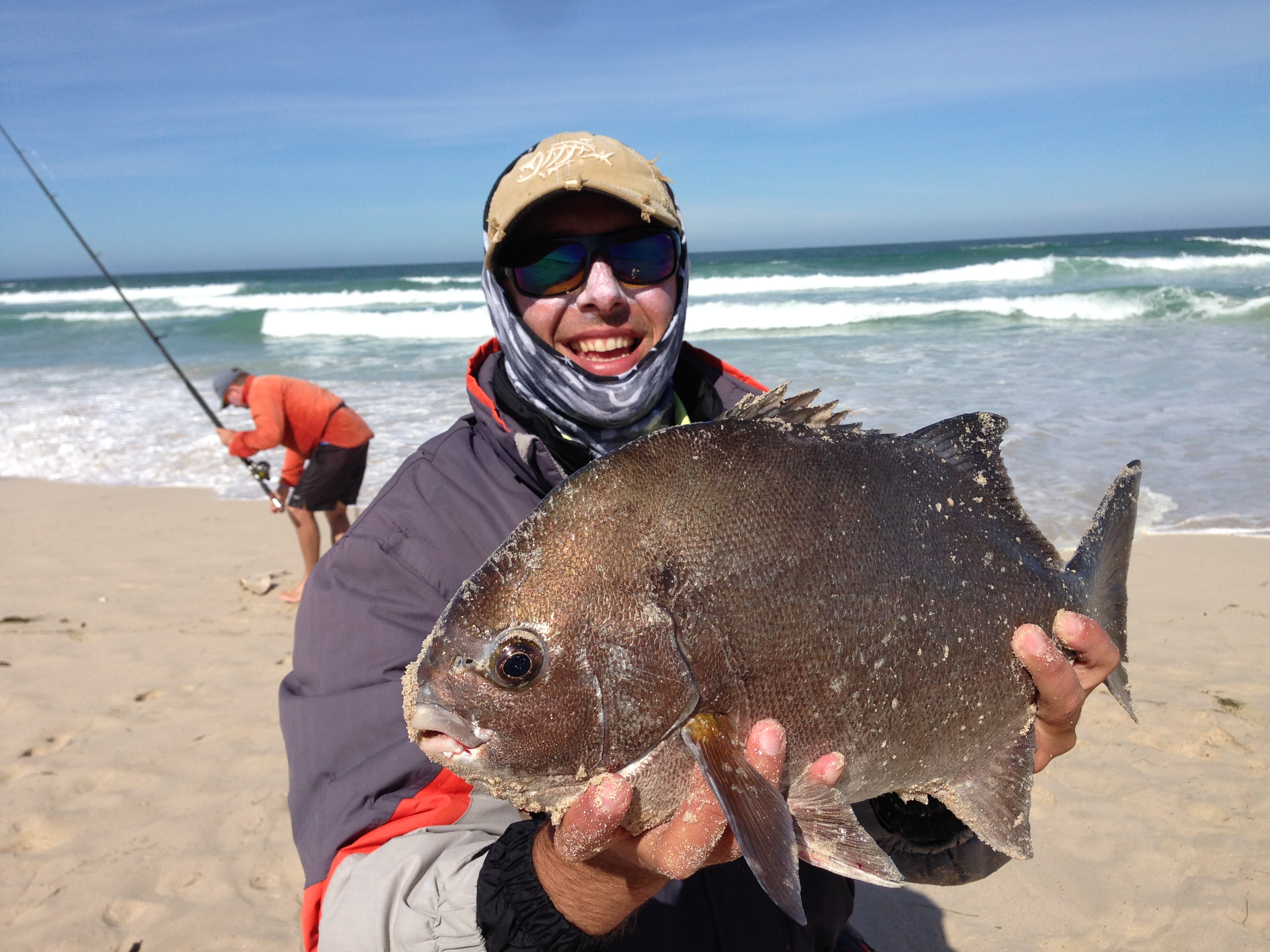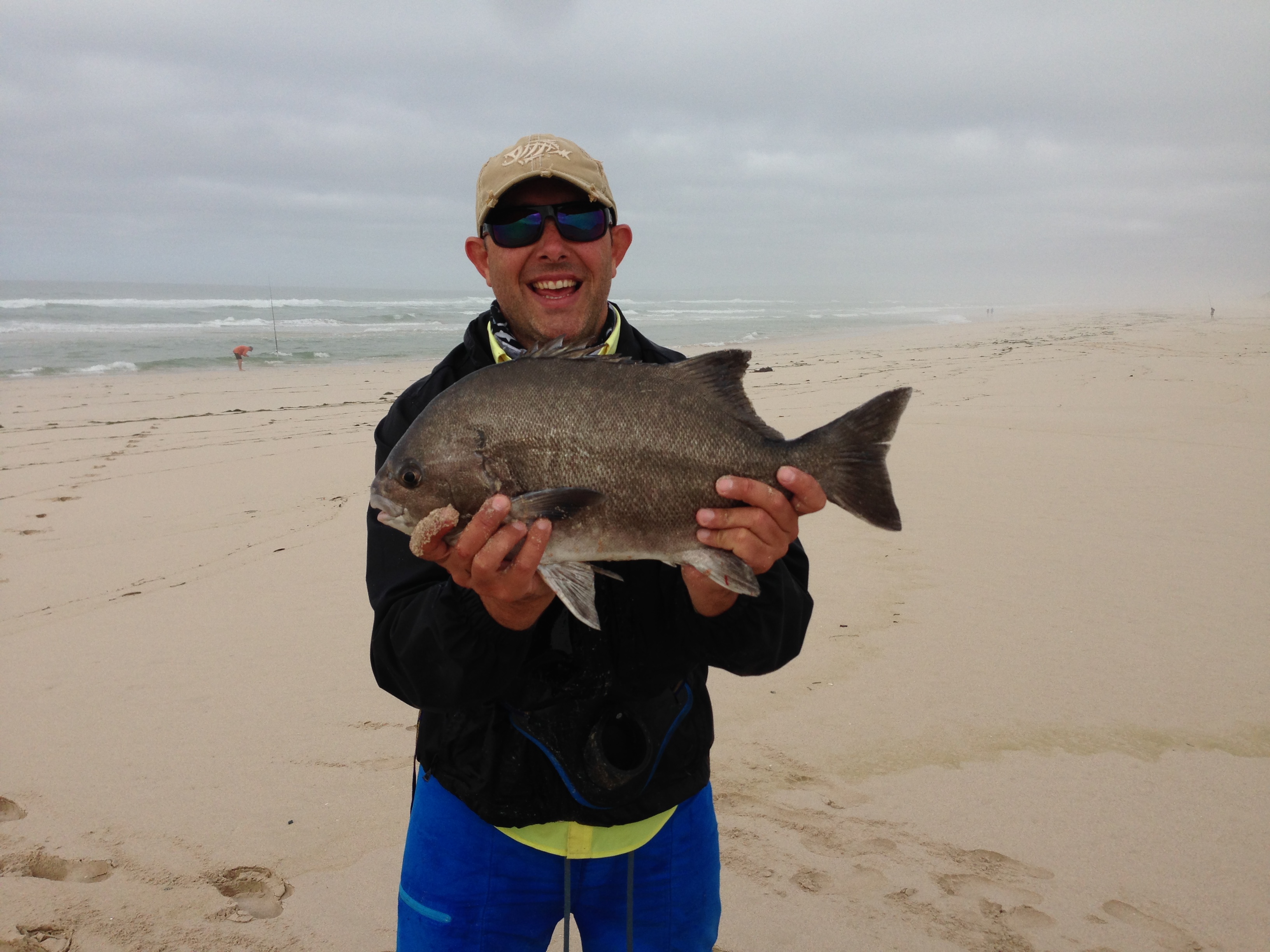 I didn’t see the take, but according to Quintie it was FLAT out! Robbie took the rod out of the pipe and the fight was on. Now let me add, by this time, we were all on about ten sand sharks, and although you hope for a fish, you’ve been disappointed ten times earlier, so he didn’t bother to play the fish. It was more a reel, pull, reel type of affair. That was, until this bugger decided to show himself… then it was chaos!!! I’m not going to lie, “Oooooo F*% dis ‘n m*&rse galjoen!”, was my very loud reaction. I decided to position myself between the fish and the shore just for in case… That was the best idea I ever had, because next moment the wave pulled back, and with Robbie pulling on the other side, it just created too much pressure and something had to give. The hook snoot parted… I tossed my rod, swallow dived ala Danie Craven and scooped the fish out of the water. Of course, it fell back in again, but on second attempt I had a better grip on the situation and run out onto the bank with it. WOW, my fish was big, but his was a giant of 55cm (FL) and in a much better condition! If mine was a blaar (leaf), this was the whole tree! The 3 fishermen in the party was all in ecstasy while the golfer stood back and casually said… “So, is dit nou ‘n grote?” Answering his own question with: “Ekt al ‘n baie groter karpe gevang…” How do you explain to someone how big the fish was? I tried with: “dis soos om ‘n hole in one en ‘n albatros te slaan in 1 rondte oppad na ‘n 59 toe”. It doesn’t happen often, if at all.