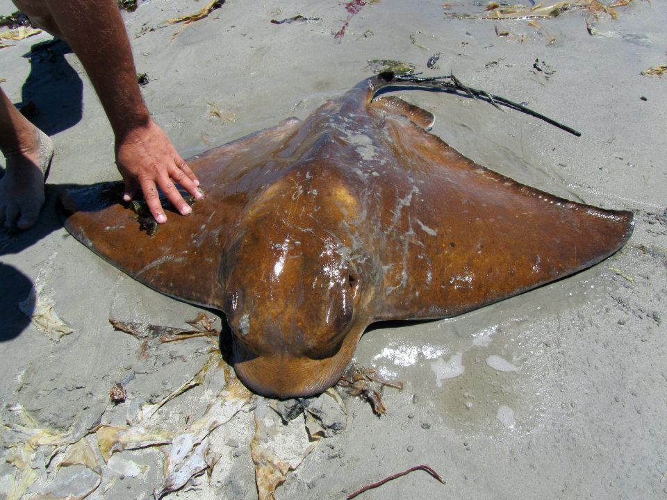 Luckily I didn’t have to wait long. Although the odds was stacked in my favour with the heavier gear it was still a great fight. I set the hook and this glider just slowly swam away. That was until he realised he had a hook in the mouth and really flew away. WOW! He made a couple more runs but after a few minutes he was within reach again. This time I gently passed the rod to my wife and took my time. I slowly stuck my hand into his mouth, made sure I had a firm grip and proceeded to walk backwards and drag him onto the beach. A stunning fish with a 107cm wing span was flapping on the side.
