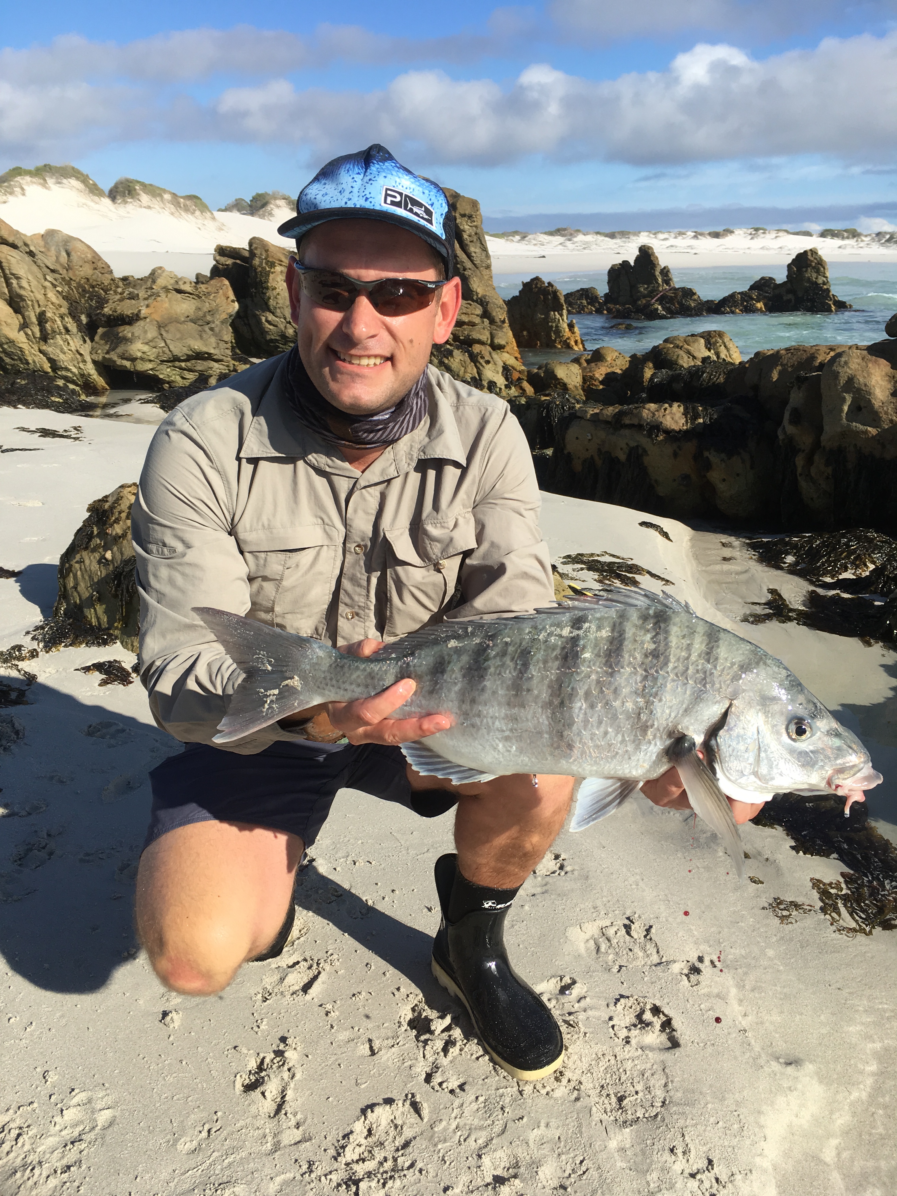 Next thing his rod jerks forward and line starts peeling of his reel. The fish swam to our right and for a brief moment got stuck behind the rocks about 10 meters in front of us. Deon was sure it was a Spotted Gully Shark by the weight on his rod and therefor didn’t care much (Spottys love wonder worm). He put more pressure on the fish than usual and pulled it hard through the rocks. Luckily the fish got unstuck and the next moment a flash of silwer was at our feet. Out of nowhere he landed a stunning Steenbras of 62cm. We couldn’t believe it.