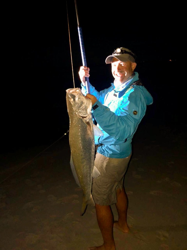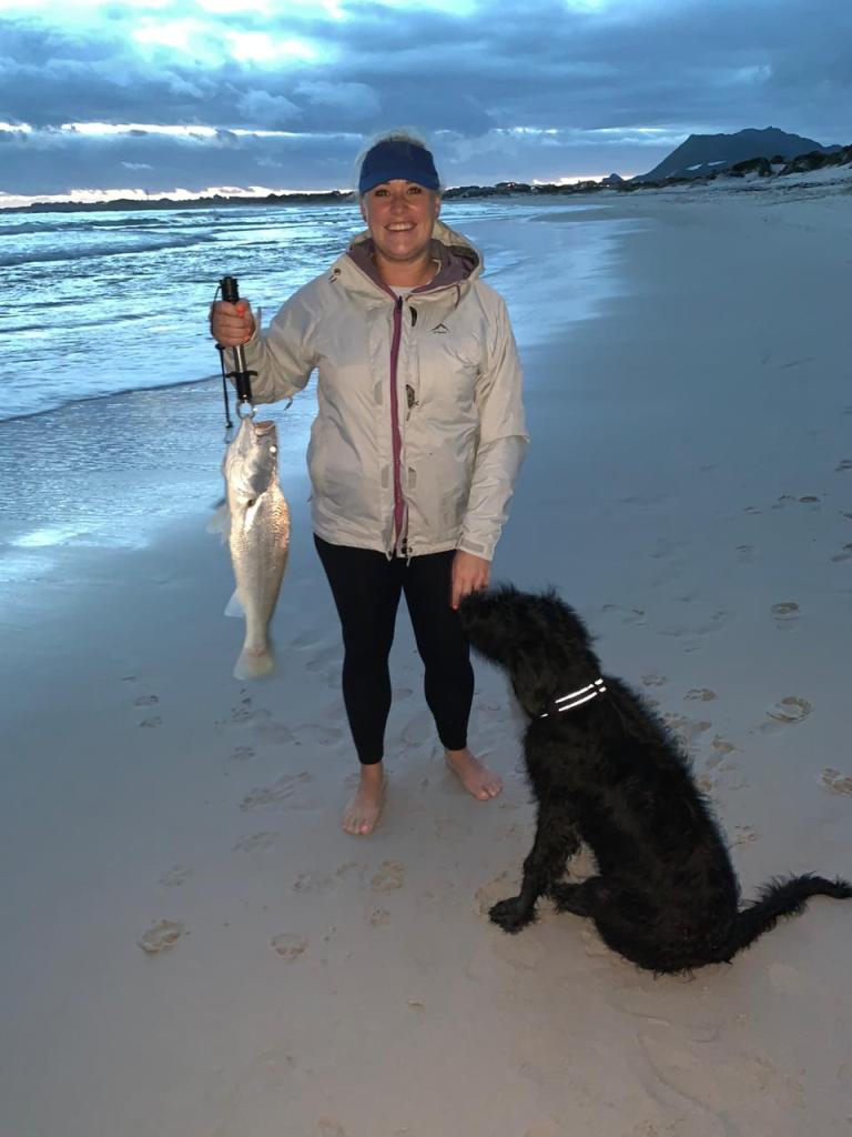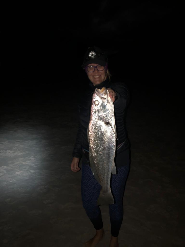 “And when I listened to your heart I hear the whole world turning, I see the shooting stars falling through your trembling hands”… My wife will strike at everything from rolling waves to single bites. She’s normally very patient but when it comes to fishing there is none, exactly the opposite to me. I took the rod from her and patiently waited for a fish to pull me down before I set the hook and passed the rod to her. The fish was feisty and gave a good account of himself before being winched onto the sand. She was very exited since this was her first ever proper Kob, a glittering silver beauty that was almost brighter than her joyful eyes.
